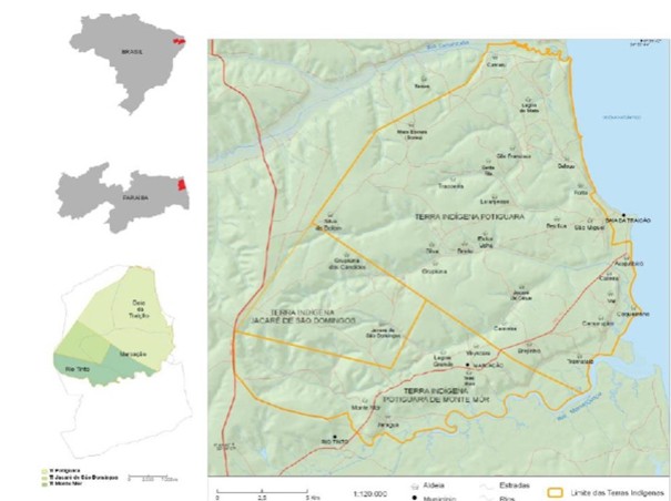 “Com uma população de aproximadamente 19 mil indígenas entre habitantes das aldeias e das cidades de Baía da Traição, Marcação e Rio Tinto, os Potiguara se concentram numa área do litoral norte paraibano situada entre os rios Camaratuba e Mamanguape. (…) O conjunto das aldeias constituem três Terras Indígenas (TIs) contíguas, perfazendo um total de 33.757 hectares. A TI Potiguara (população de 8.109 pessoas), a TI Jacaré de São Domingos (população de 449 pessoas) e a TI Potiguara de Monte Mór (população de 4.447 pessoas)”. (Cardoso; Guimarães, 2012, p. 15)