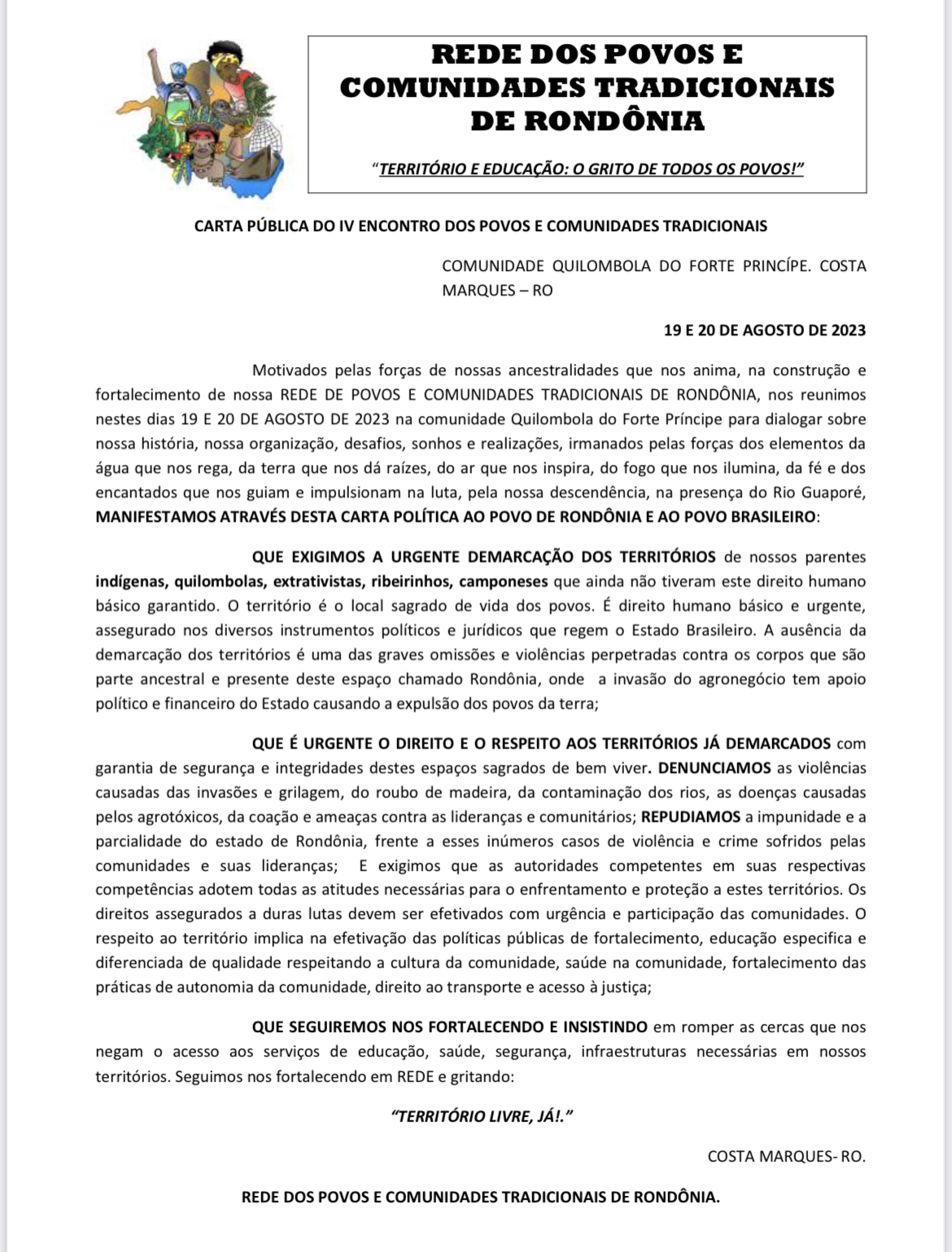 CARTA das comunidades quilombolas e indígenas do Vale do Guaporé (RO). Comissão Pastoral da Terra, republicado por Combate Racismo Ambiental, Rio de Janeiro, RJ, 25 set. 2018. Disponível em: https://shre.ink/8aBe. Acesso em: 14 maio 2024.