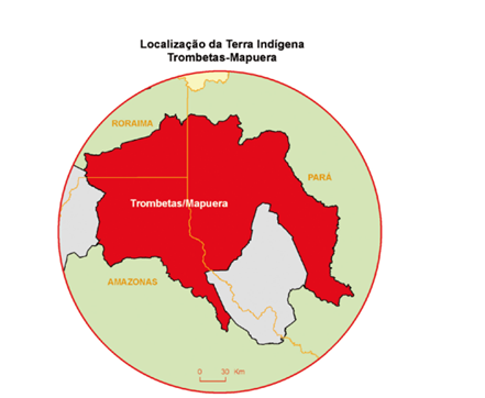 “Fica homologada a demarcação administrativa, promovida pela Fundação Nacional do Índio – FUNAI, da terra indígena destinada à posse permanente dos grupos indígenas do complexo cultural Tarumã/Parukoto (Karapawyana, Waiwai, Katuena, Hixkaryana, Mawayana, Xereu, Cikiyana, Tunayana, Yaipîyana, Pianokoto), Waimiri-Atroari e Grupos Indígenas Isolados a seguir descrita: a Terra Indígena denominada Trombetas Mapuera, com superfície de três milhões, novecentos e setenta mil, oitocentos e noventa e oito hectares, quatro ares e vinte centiares e perímetro de um milhão, quinhentos e sessenta e dois mil, duzentos e oitenta e dois metros e quarenta e oito centímetros, situada nos Municípios de Nhamundá e Urucará, no Estado do Amazonas, Faro e Oriximiná, no Estado do Pará, Caroebe e São João da Baliza, no Estado de Roraima.” (Brasil, 2009)